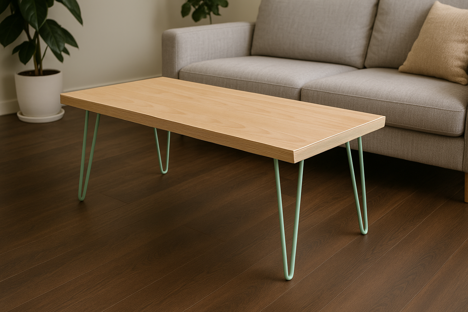 When combined with hairpin legs, the table achieves a balanced aesthetic. The legs highlight the clean, architectural quality of the plywood, while the plywood offsets the industrial look of steel with warmth and subtle grain. Together they produce a coffee table that feels light, functional, and quietly stylish.