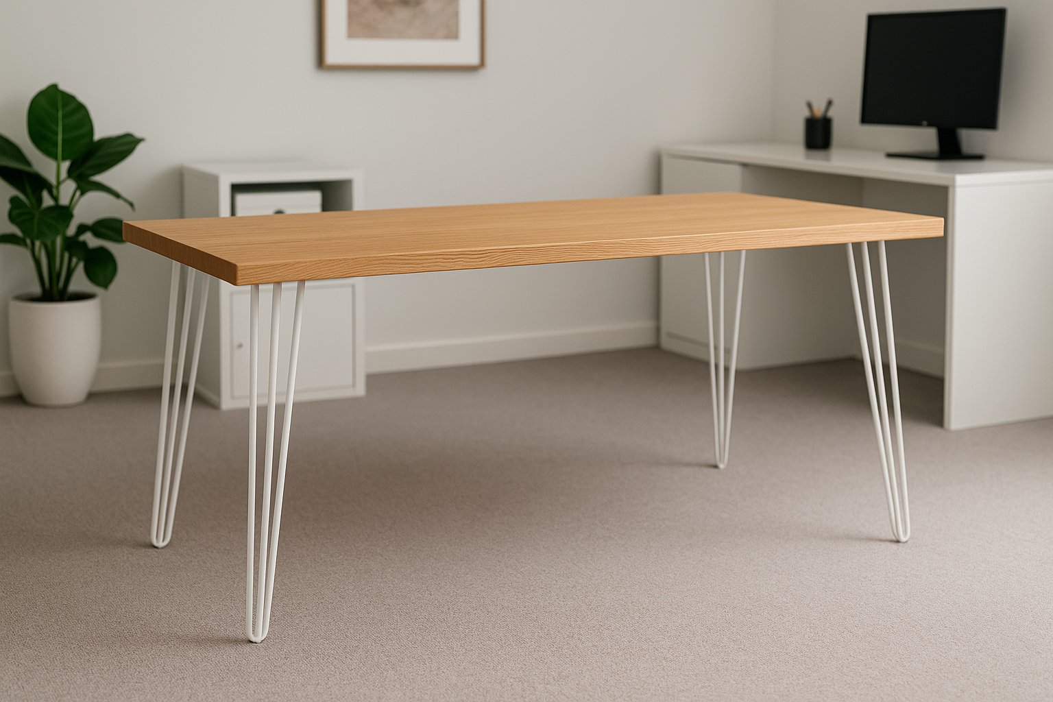A desk made with hairpin legs and a solid oak top has a distinctive style that feels both contemporary and classic. The slimness of the steel legs contrasts with the natural depth and warmth of the oak. This creates a look that feels minimal but not cold, robust but not clunky. In terms of interiors, it suits a wide range: Scandinavian-inspired spaces with their preference for pale woods and simplicity, industrial-style apartments where metal features prominently, mid-century homes that nod to the era when hairpin legs were first invented, and modern family homes where a versatile desk needs to slot into a living room, bedroom, or dedicated office space without looking out of place.