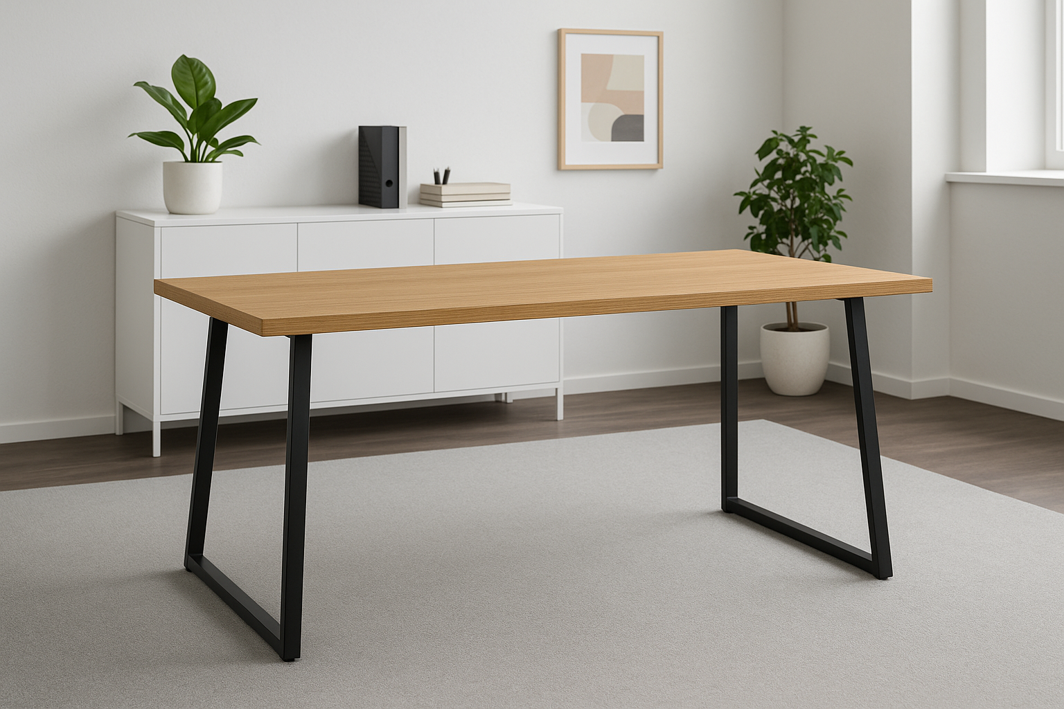 A desk with an oak veneer top and steel box section legs has a clean, modern look that bridges natural and industrial design. The oak veneer provides the character and warmth of real wood grain, while the steel legs add structure, geometry, and strength. Together, they create a desk that feels both substantial and elegant. This style suits contemporary apartments, modern rustic homes, minimalist offices, and creative studios. The look is professional without being overly formal, and the combination of wood and steel allows the desk to blend into a wide range of décor.