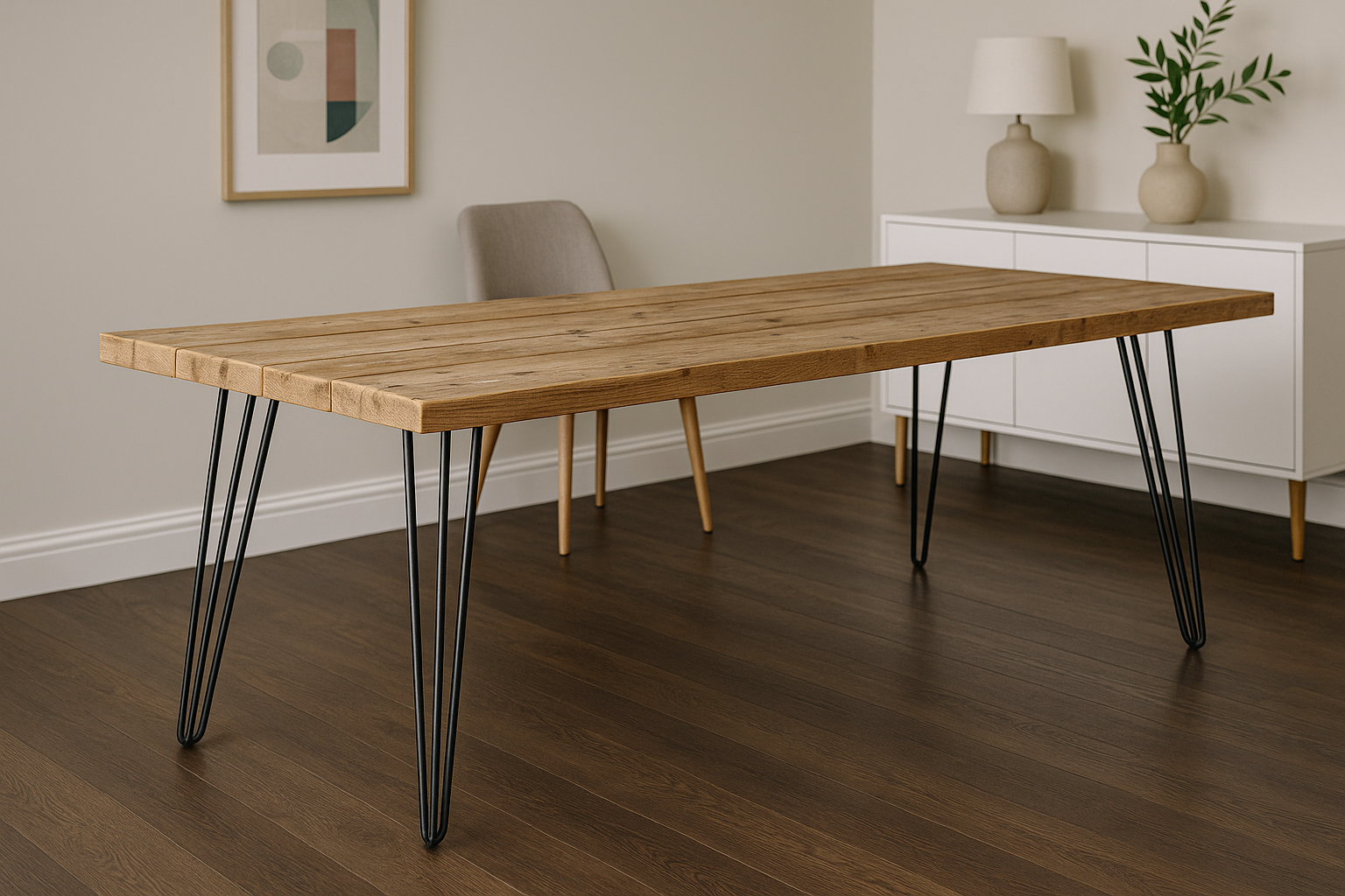 Hairpin legs are made from bent steel rods welded to a mounting plate, usually in either two-rod or three-rod versions depending on the strength required. Their name comes from their resemblance to a bent hairpin, and their appeal lies in their slim profile and mid-century-inspired look. On a dining table, they provide strength while staying visually subtle, allowing the character of the scaffold board top to stand out.
